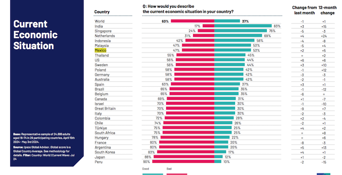 La percepción positiva de la economía por gran parte de los ciudadanos de México, logró que este país se ubique en los primeros seis lugares de las naciones en las que la firma Ipsos llevó a cabo la encuesta, sólo por debajo de la India, con el 83 por ciento; Singapur, con el 76 por ciento; Países Bajos, con el 69 por ciento; Indonesia, con el 58 por ciento; y Malasia, con el 53 por ciento.