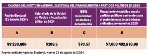 Con base en esa fórmula, señala el acuerdo del Consejo General del Instituto Nacional Electoral del viernes 23 de agosto del 2024, que al multiplicar el número total de ciudadanos inscritos en el Padrón Electoral con fecha al 31 de julio del 2024, esto es 99 millones 239 mil 808 personas, por el 65 por ciento del valor diario de la Unidad de Medida y Actualización (UMA), que equivale a $70.57 pesos, da como resultado el financiamiento público anual para los partidos políticos, por concepto de actividades ordinarias permanentes para el 2025 por la cantidad de $7,003 millones 402 mil 870 pesos.