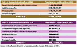 En un año en el que no habrá elecciones federales, el financiamiento para las actividades ordinarias, las actividades específicas, la franquicia postal y la franquicia telegráfica, representarán un subsidio de 7 mil 354 millones 266 mil 504 pesos, que se repartirán Morena, PAN, PRI, Partido Verde Ecologista de México, Movimiento Ciudadano y Partido del Trabajo.