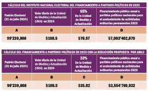 En su iniciativa de reforma constitucional en materia electoral, López Obrador propone reformar el Artículo 41 de la Carta Magna para que quede en los siguientes términos: “El financiamiento público [a los partidos políticos con registro oficial] para el sostenimiento de sus actividades ordinarias permanentes se fijará anualmente, multiplicando el número total de ciudadanos inscritos en el padrón electoral por el treinta y tres por ciento del valor diario de la Unidad de Medida y Actualización”.