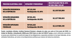 En los comicios del pasado domingo 2 de junio del 2024, el promedio de votos que se recibieron, en las elecciones de Presidente de la República, Senadores y Diputados Federales, fue de 60 millones de sufragios. Si multiplicamos el 33 por ciento de una Unidad de Medida y Actualización (UMA), es decir, 35.82 pesos, por esos 60 millones de votos reales, que verdaderamente recibieron los partidos, eso sería lo más justo. Entonces los partidos políticos sí estarían obligados a trabajar para ganar la simpatía y el respaldo de la gente, pues más votos en las urnas les representarían más dinero de financiaiento anual.