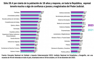 La reforma es obligada en un país en donde sólo el 39.4 por ciento de la población, en promedio, dice tener mucha o algo de confianza a magistrados y jueces. A esta conclusión llega al Encuesta Nacional de Calidad e Impacto Gubernamental 2023 realizada por el Instituto Nacional de Estadística y Geografía, con base en una robusta muestra en 46 mil viviendas a todo lo largo y ancho del país.