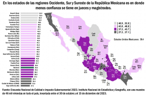 En los estados de las regiones Occidente, Sur y Sureste de la República Mexicana es en donde menos confianza se tiene en jueces y magistrados: el rango de aprobación es entre el mínimo del 27.2 por ciento y un máximo del 42.8 por ciento.