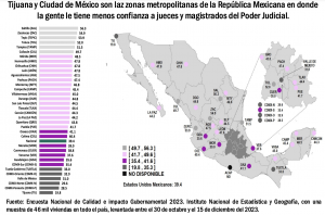 Mientras que las zonas metropolitanas en las que la gente muestra menos empatía por magistrados y jueces son las de Tijuana, Baja California, y Ciudad de México, en el Valle del Anáhuac, donde el respaldo a estos funcionarios del poder judicial oscila entre el 19.8 por ciento y el 32.9 por ciento.