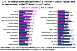 Observado desde otra perspectiva el fenómeno de la administración de Justicia y del Poder Judicial, el 66.7 por ciento de los mexicanos considera que la corrupción es un asunto frecuente entre jueces y magistrados, y sólo el 39.4 por ciento confía en ellos.
