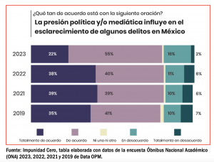 El estudio de Impunidad Cero refleja que la percepción de los mexicanos mayores de 18 años es consistente: el 77 por ciento considera en mayor o menor medida que el esclarecimiento de los delitos está condicionado a la capacidad de ejercer presión política o mediática. Además, las opiniones ciudadanas identifican que el origen de la impunidad en el país radica en las deficiencias presentes tanto en la procuración como en la impartición de justicia. Esta percepción se ha mantenido constante en cada una de las ediciones de la encuesta, realizada desde 2019. Detrás de ella se manifiesta la noción de que en México el acceso a la justicia está condicionado.