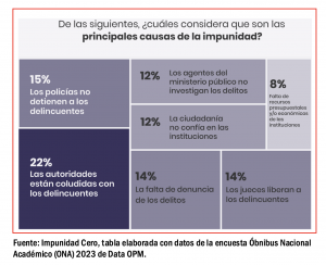 Advierte Impunidad Cero que, con respecto a las principales causas de la impunidad en México, las opiniones registradas demuestran que los ciudadanos identifican problemas tanto en la procuración como en la impartición de justicia. El 22 por ciento considera que la impunidad se debe a que las autoridades están coludidas con los delincuentes. El 15 por ciento identifica que los policías no detienen a los delincuentes. Por su parte, el 14 por ciento considera que la falta de denuncia influye en la impunidad, y un mismo porcentaje de las personas encuestadas opina que los jueces liberan a los delincuentes. De manera similar, el 12 por ciento opina que los agentes del ministerio público no investigan los delitos, y otro 12 por ciento percibe la desconfianza de la ciudadanía en las instituciones como parte del origen del problema.