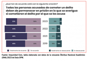 En el estudio de Impunidad Cero, el 73 por ciento de los encuestados está total o parcialmente de acuerdo con que “todas las personas acusadas de cometer un delito deben permanecer en prisión en lo que se averigua si cometieron el delito por el que se les acusa”. Los niveles de aceptación de la prisión preventiva en cada encuesta realizada, permanece arriba del 70 por ciento. La gran mayoría de las personas de 18 años y más está parcial o totalmente de acuerdo con que todos los delitos se deben sancionar con cárcel (80 por ciento). Sólo el 19 por ciento está total o parcialmente en desacuerdo con esta afirmación.