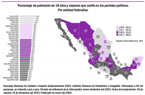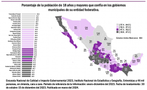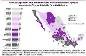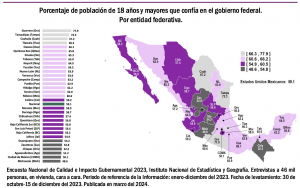Al gobierno federal no le va tan mal en la encuesta del INEGI, pues en el estado de Guerrero el 77.9 por ciento dice que confía en la administración de Andrés Manuel López Obrador; el porcentaje promedio en el país es del 59.1 por ciento y la más baja calificación de confiabnza es del 48.6 por ciento. Sólo en Michoacán el índice de confianza en el gobierno federal está por debajo del 50 por ciento.