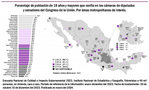 Si revisamos los porcentajes de confianza en senadores y diputados por zonas metropolitanas en la República Mexicana, únicamente en la de Saltillo, Coahuila, alcanzan el 56.7 por ciento y después, todos los índices de confianza están por debajo del 50 por ciento. Hay dos zonas metropolitanas en las cuales la confianza en los legisladores federales anda por los suelos: en Tijuana, donde apenas marcan 17 por ciento y en Ciudad de México, donde su registro más alto es del 31.7 por ciento.