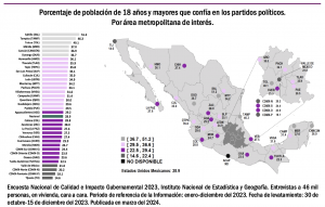 La gente de Coahuila suele ser más generosa con los partidos políticos, pues en la zona metropolitana de Saltillo el porcentaje de confianza en esas instituciones es del 51.2 por ciento y de ahí para abajo. Las zonas metropolitanas en donde menos confianza les tienen a los partidos políticos son, nuevamente, Tijuana y Ciudad de México.