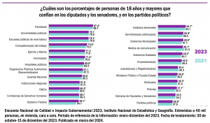 Este asunto podría contribuir a mejorar la imagen de senadores y diputados que por el momento no gozan del mejor crédito entre los ciudadanos del país. Los nuevos legisladores, que tomaron posesión apenas el pasado domingo 1 de septiembre, llegan a sus nuevas tareas con apenas un índice de confianza del 34.5 por ciento, de acuerdo con la Encuesta Nacional de Calidad e Impacto Gubernamental 2023, del Instituto Nacional de Estadística y Geografía, publicada en marzo del 2024.