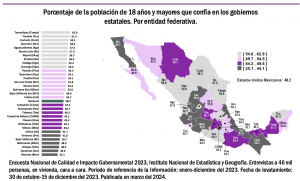 La encuesta refleja también que el estado en donde la gente expresa más confianza en su gobierno estatal es Tamaulipas, con el 62.9 por ciento y los ciudadanos que expresan menos confianza por su adminisrtración estatal son los de Morelos, donde termina su periodo Cuauhtémoc Blanco Bravo, con el 35.3 por ciento.