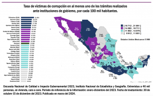 Finalmente, las tasas más alta de casos de corrupción por cada 100 mil habitantes se ubican, según juicio de su población, a los estados de Chihuahua, Guerrero, Tabasco, Sinaloa, Quintana Roo y Oaxaca. Mientras que los índices más bajos de corrupción se experimentaron en Zacatecas, Nayarit, Colima, Baja California Sur y Guanajuato. Todos los datos, según la Encuesta Nacional de Calidad e Impacto Gubernamental 2023, realizada por el Instituto Nacional de Estadística y Geografía, y presentada en marzo del 2024.