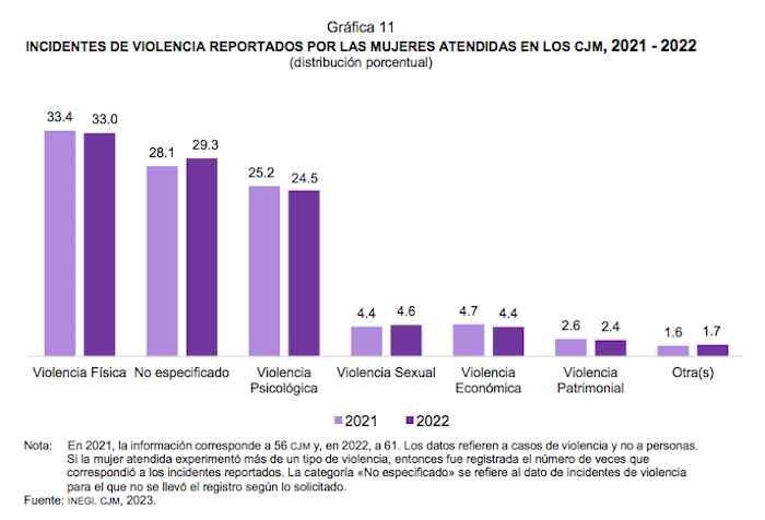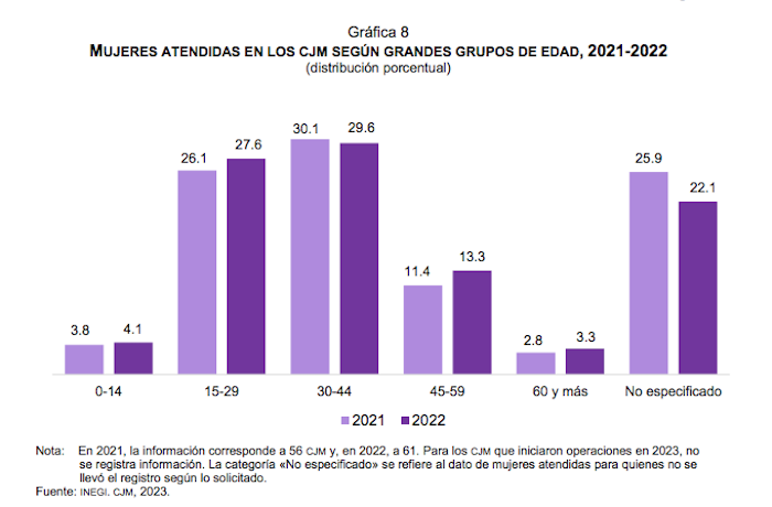 En febrero del 2024, el Instituto Nacional de Estadística y Geografía (INEGI) informó, a través de los resultados del programa estadístico Centros de Justicia para las Mujeres (CJM) 2023, que entre 2021 y 2022 los CJM atendieron a 967 mil 920 mujeres por situación de violencia.