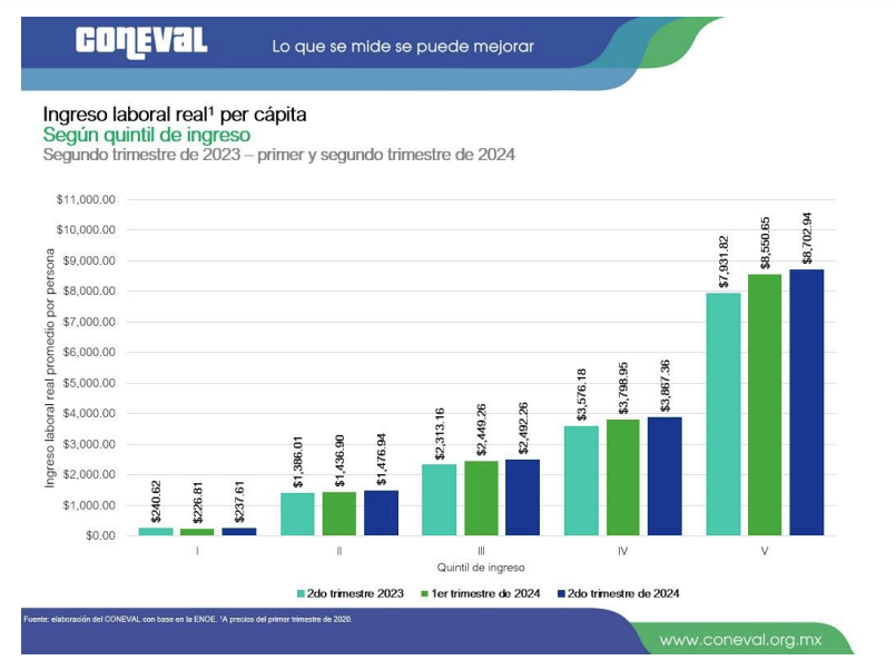 Esta reducción anual de la pobreza laboral en el segundo trimestre de 2024 se dio ante un aumento en el empleo (hubo 805 mil 200 personas más), así como un incremento en el ingreso laboral per cápita de 8.9 por ciento, al pasar de 3 mil 76.13 pesos a 3 mil 350.84 pesos entre el segundo trimestre de 2023 y el mismo periodo 2024.