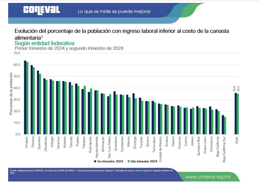 Al desagregar los datos del Coneval por estados, se muestra que en 27 de las 32 entidades federativas se presentó una reducción de la pobreza laboral entre el primer y el segundo trimestre de 2024.