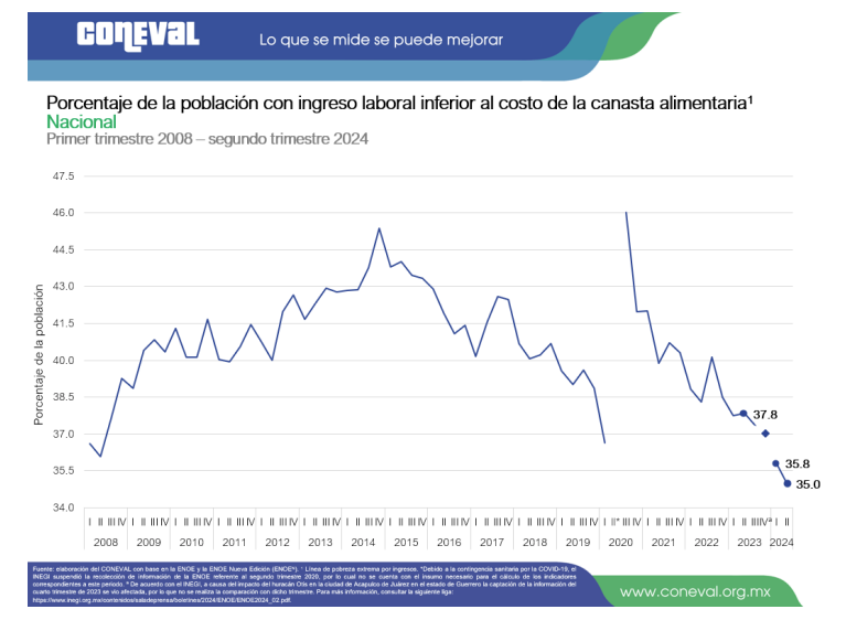 En contraste, el nivel más bajo de la pobreza laboral fue en el segundo trimestre de 2024, un mínimo histórico desde que se tienen registros: pasó de 37.8 por ciento en el primer trimestre de 2023 a 35 por ciento en el mismo periodo de este año.