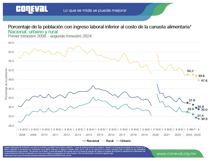 La disminución entre el segundo trimestre de 2023 y el mismo periodo de 2024 en la pobreza laboral se dio en un contexto donde el valor monetario de la canasta alimentaria mostró incrementos de 5.8 y 5.7 por ciento en los ámbitos rural y urbano, respectivamente, mientras que la inflación general anual promedio se ubicó en 4.8 por ciento.