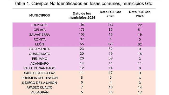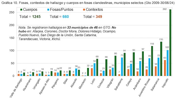 Los 10 municipios con mayor número de cuerpos y fosas clandestinas son Irapuato, Salamanca, Juventino Rosas, Acámbaro, Celaya, Salvatierra, Villagrán, Cortazar, León y Moroleón. Un punto máximo en los hallazgos fue en 2020, con el registro de 309 cuerpos en 145 fosas. El segundo año con más registros fue el 2023, con 243 cuerpos en 130 fosas clandestinas.