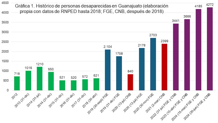 La cifra de personas desaparecidas se ha multiplicado casi siete veces, pasando de 621 personas en abril de 2018 a cuatro mil 272 en junio de 2024. Los municipios con más personas desaparecidas son Celaya (505 personas), Irapuato (472), León (459), Villagrán (265) y Pénjamo (222).
