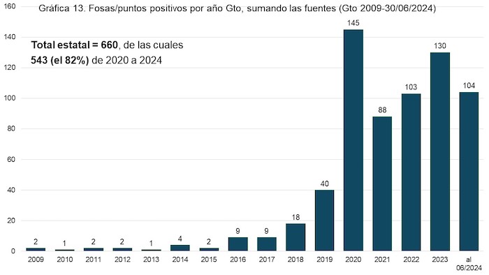 Entre enero de 2009-junio de 2024 se registraron en Guanajuato por lo menos 660 fosas clandestinas, en 349 distintos contextos de hallazgo de las cuales fueron exhumados mil 245 cuerpos en 33 de los 46 municipios.