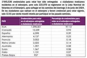 El dato más reciente, proporcionado por el Instituto Nacional Electoral, actualizado al pasado viernes 30 de agosto del 2024, documenta que hay por lo menos 1 millón 645 mil 536 ciudadanos mexicanos que radican fuera de nuestrra fronteras, que tienen credencial de elector vigente, pero solo 223,970 se registraron en la Lista Nominal de Votantes en el Extranjero, para sufragar en los comicios del domingo 2 de junio del 2024. De los ciudadanos que radican en el extranjero y tienen credencial para votar vigente, solo 13.61 por ciento mostró interés por participar en los pasado comicios.