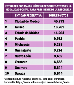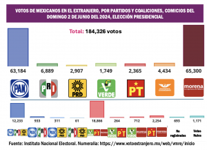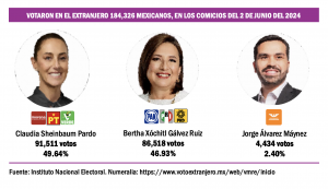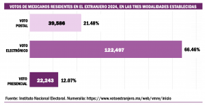 Del resultados del Voto de los Mexicanos Residentes en el Extranjero, en el Proceso Electoral Federal del domingo 2 de junio del 2024, para la elección de Presidente de la República, que fue de 184,326 sufragios, el voto postal representó 39,586 sufragios; fueron depositados por vía electrónica 122,497 votos y de manera presencial, en consulados y embajadas en el extranjero, se manifestaron 22,243 compatriotas.