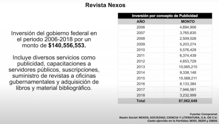 En este sentido, Jesús Ramírez Cuevas expuso en la mañanera del 8 de octubre del 2020 que Nexos recibió una inversión gubernamental de 140 millones 556 mil pesos y 87 millones más por publicidad entre el 2006 y el 2018.