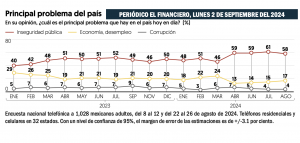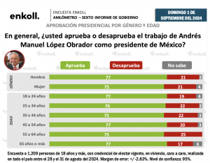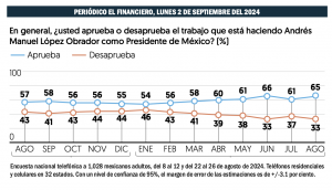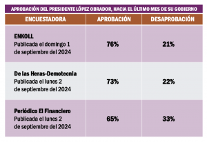 El porcentaje más flojo de aprobación al presidente saliente lo registra el periódico El Financiero, que le atribuye un 65 por ciento de respaldo, que de cualquier manera muestra un aumento permanente durante los últimos doce meses, pues en su registro de agosto del 2023 tenían apoyo del 57 por ciento.