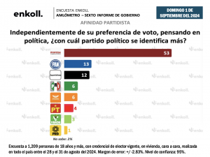 Y por supuesto que el fuerte respaldo que el presidente conserva en el cierre de su sexenio es compartido con su partido, Morena, con el cual se identifica el 53 por ciento de los encuestados por Enkoll, en tanto que el segundo lugar se lo disputan, en una cerrada lucha, el PAN con 13 por ciento y los apartidistas declarados, que representan el 12 por ciento de la muestra estadística en la encuesta de Enkoll.