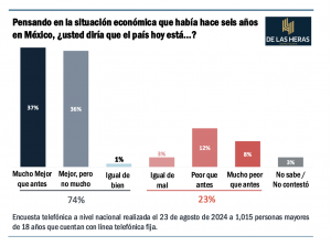 Mientras tanto, el 74 por ciento de las personas entrevistadas por la consultora De las Heras-Demotecnia considera que, con respecto a su situación económica de hace seis años, ahora se encuentra mejor o mucho mejor, casi en el cierre del gobierno de López Obrador.