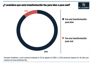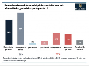 También es razonablemente favorable la evaluación que los entrevistados por De las Heras hacen con respeto a la salud y el 66 por ciento considera que está mejor o mucho mejor que hace seis años, en el cierre de la actual administración.