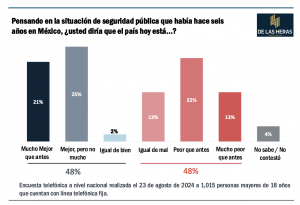 En el caso de la seguridad pública las opiniones están divididas, pues entre quienes consideran que la situación mejoró y quienes no observan un cambio favorable o estiman que empeoró, marcan empate en el 48 por ciento.