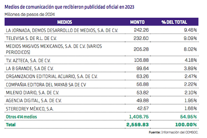 Estos tres medios, arrojan los mismos datos, sumaron 680 millones de pesos, lo que representa el 26.57 por ciento del total. En contraparte, 414 medios agruparon el 54.95 por ciento del gasto en medios. Aunque en 2023 la concentración de recursos continuó, señalan las organizaciones, “hubo ligeros cambios en los tres principales beneficiarios, destacando la posición de La Jornada y la incorporación de Medios Masivos Mexicanos en lugar de TV Azteca”.