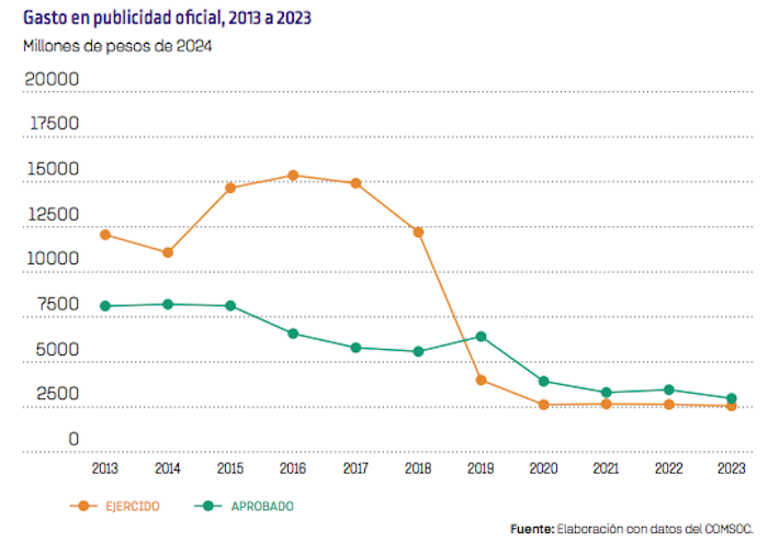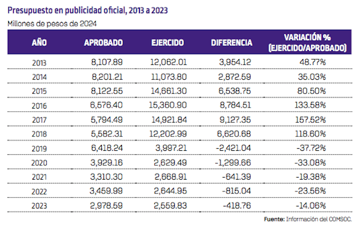 “En este Gobierno se ha subejercido el presupuesto destinado a la publicidad oficial, alrededor de 27.85 por ciento en el periodo 2019 a 2023. Esta reducción es resultado de la aplicación de la ‘austeridad republicana’. Si bien la austeridad puede ser vista como un esfuerzo para reducir el gasto público, también plantea interrogantes sobre las consecuencias de limitar los recursos destinados a la difusión de información oficial como afectar la capacidad del Gobierno para mantener a la ciudadanía informada y garantizar la transparencia en sus acciones”, destaca el reporte.