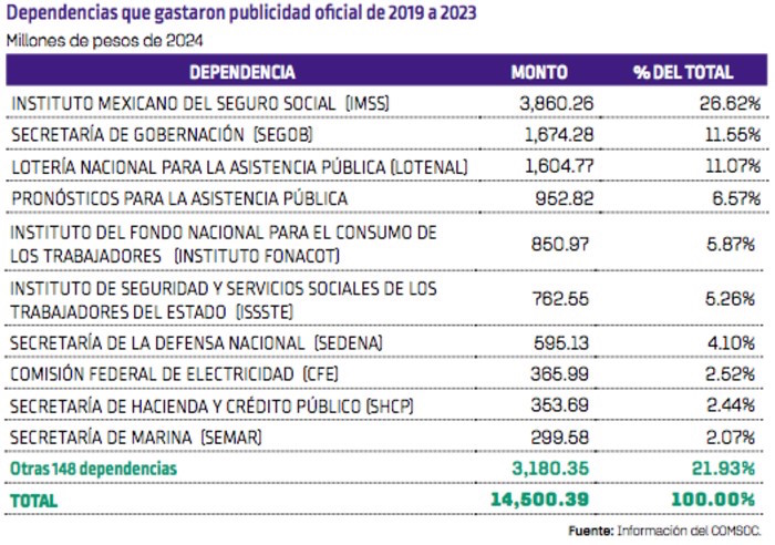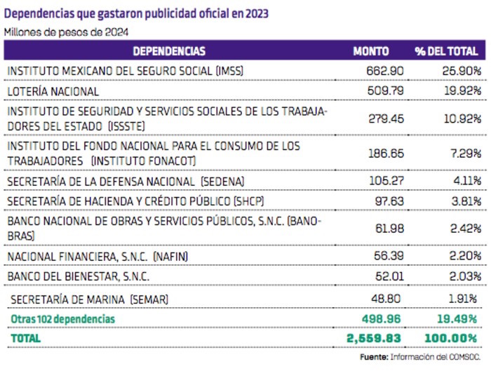 Tan sólo este año, 10 dependencias gastaron el 80.51 por ciento (dos mil 060 millones). El Instituto Mexicano del Seguro Social (IMSS), la Lotería Nacional y el Instituto de Seguridad y Servicios Sociales de los Trabajadores del Estado (ISSSTE) fueron las dependencias que más gastaron en publicidad oficial, acumulando en conjunto mil 452 millones de pesos, lo que representa el 56.73 por ciento del total. “Esto marca un cambio con respecto a 2022, cuando el ISSSTE no figuraba entre las diez dependencias con mayor gasto en publicidad oficial. La inclusión del ISSSTE en 2023 destaca una reconfiguración en la distribución del presupuesto entre las principales dependencias del Gobierno federal”.