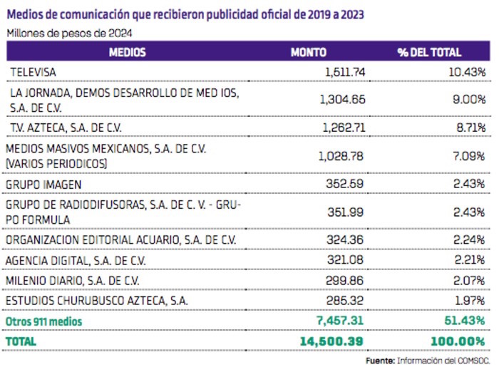 En general, de 2019 a 2023, un total de 921 medios de comunicación recibieron publicidad oficial. Diez de ellos concentraron el 48.57 por ciento de los recursos, mientras que los 911 medios restantes se repartieron el 51.43 por ciento.