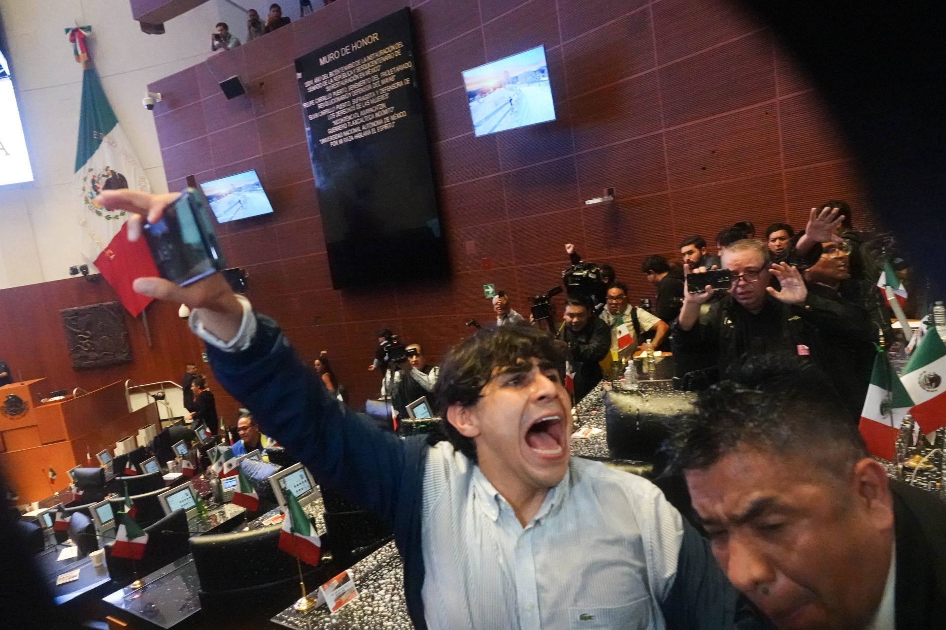 Fue alrededor de las 16:30 horas cuando la Senadora Claudia Anaya Mota fijaba su voto particular que un grupo de alrededor de 200 manifestantes ingresó a la parte alta del salón de sesiones. Los senadores del Partido Acción Nacional reclamaron al Senador Noroña la falta de medidas para garantizar la seguridad de los legisladores ante lo cual se decretó el receso indefinido.