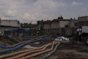 Las inundaciones, mezcladas con aguas residuales, han invadido calles, viviendas y negocios en Culturas, el vecindario de Salazar en Chalco, durante más de un mes.