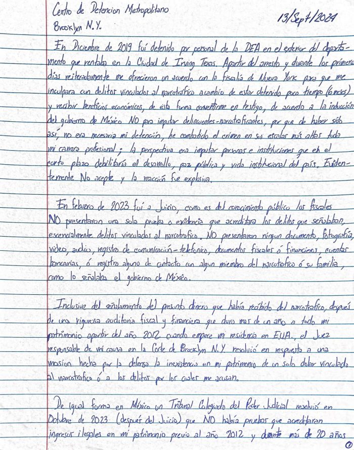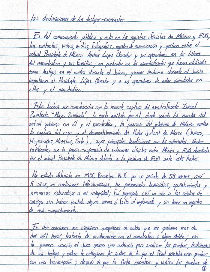 En un sentido similar, detalló que un Tribunal Colegiado del Poder Judicial resolvió en octubre de 2023, después de su juicio en Nueva York, que no existían supuestas pruebas para acreditar ingresos ilegales en su patrimonio previo al 2021. En cambio, agrega, durante el juicio fue utilizada "información falsa proporcionada por el Gobierno de México y los dichos de testigos con antecedentes criminales reconocidos y declarados por ellos".