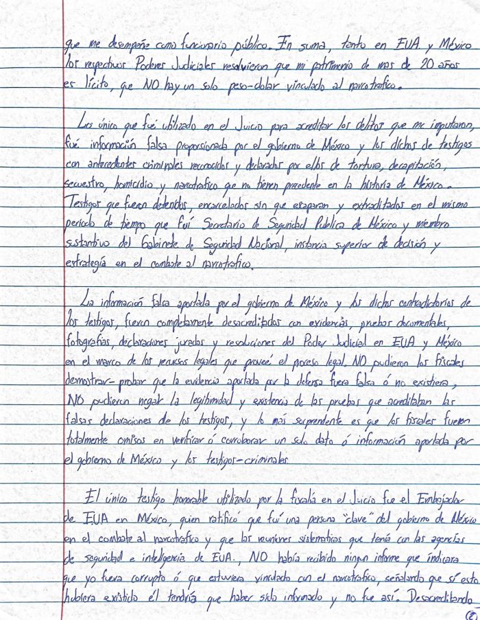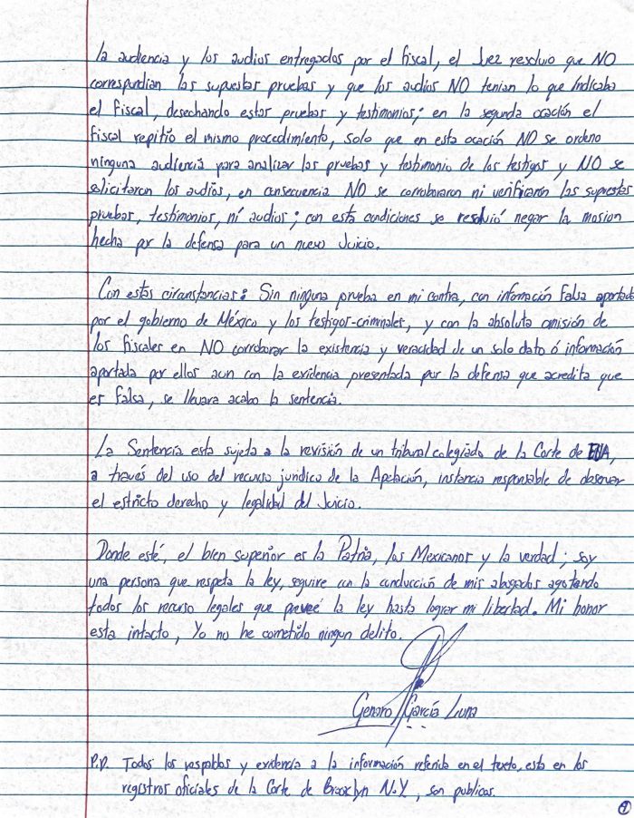 García Luna denunció que durante su juicio presuntamente no fue presentada "una sola prueba o evidencia" que acreditara los delitos a los que un jurado en febrero de 2023 lo declaró culpable. Inclusive, añade, con respecto al presunto dinero que había recibido, afirmó que después "una rigurosa auditoría fiscal y financiera que duró más de un año" a todo su patrimonio desde el 2012, el Juez responsable de su causa penal en Brooklyn resolvió la inexistencia en su patrimonio de "un sólo dólar vinculado al narcotráfico o a los delitos por los cuales me acusan".