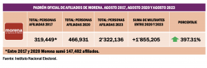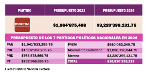Electa para el periodo 2024-2027, Alcalde Luján también encabezará el partido político con más recursos económicos en el escenario nacional, pues tan sólo en 2024, el presupuesto autorizado para Moena asciede a más de 3 mil 220 millones de pesos. Cuota que aumentará en el 2025, cuando el presupuesto para los partidos políticos se repartirá solo entre seis instituciones: PAN, PRI, PVEM, PT, Movimiento Ciudadano y Morena, luego que el PRD perdió su registro el pasado mes de junio al no lograr el mínimo del 3 por ciento de la votación nacional que exige la ley para conservar el financiamiento oficial.