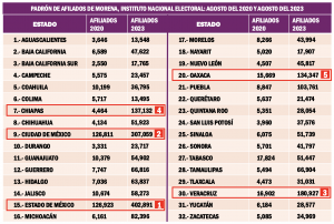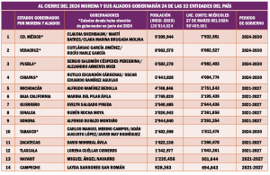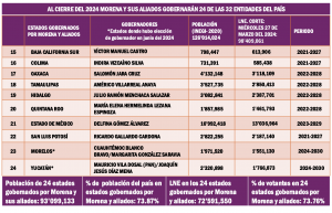 Morena cerrará el 2024 administrando los destinos de los habitantes de por lo menos 24 de las 32 entidades del país, lo que le representará influencia administrativa sobre poco más de 93 millones de pesonas, que equivalen al 73.87 por ciento de los habitantes de toda la República donde, según el Censo de Población 2020 del Instituto Nacional de Estadística y Geografía hay por lo menos 126 millones de habitantes.