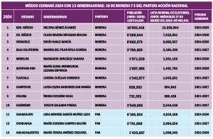Un dato relevante en la presencia política de Morena es que de las 13 gobernadoras que hay en el país, 10 son del partido guinda y las tres restantes, del PAN.
