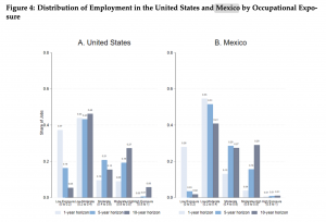 "Mirando el horizonte de cinco años, la proporción de empleos en las categorías de baja exposición disminuye al 59 por ciento en Estados Unidos y al 54 por ciento en México. La categoría de exposición media aumenta al 21 por ciento en Estados Unidos y al 29 por ciento en México. Las categorías de alta exposición siguen siendo relativamente bajas, con un 20 por ciento en Estados Unidos y un 17 por ciento en México, lo que indica un fuerte aumento de la vulnerabilidad durante este período", detalla el documento.