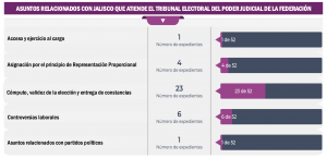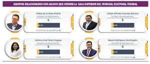 La máxima instancia jurisdiccional en materia electoral del país tiene en este momento, en el proceso de instrucción, un Juicio de Revisión Constitucional promovido por Morena, un Juicio para la Protección de los Derechos Político Electorales del Ciudadano, presentado por la candidata de Morena a la gubernatura de Jalisco, Claudia Delgadillo González, así como cuatro Juicios Electorales que reclaman la injerencia en el proceso electoral del cardenal arzobispo emérito de Guadalajara, Juan Sandoval Íñiguez y del presbítero Sergio Joel Ascencio.