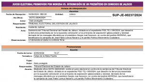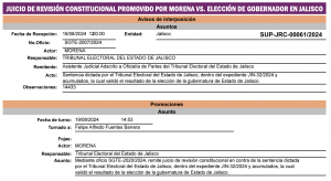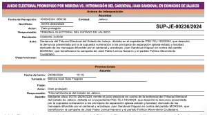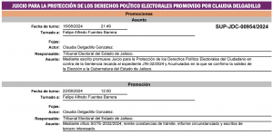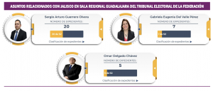 La máxima instancia jurisdiccional en materia electoral del país tiene en este momento, en el proceso de instrucción, un Juicio de Revisión Constitucional promovido por Morena, un Juicio para la Protección de los Derechos Político Electorales del Ciudadano, presentado por Claudia Delgadillo, así como cuatro Juicios Electorales que reclaman la injerencia en el proceso electoral del cardenal arzobispo emérito de Guadalajara, Juan Sandoval Íñiguez y del presbítero Sergio Joel Ascencio.