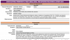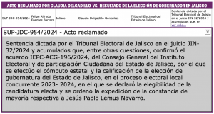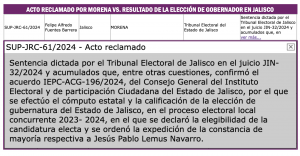 Ciudad de México, 25 de septiembre (SinEmbargo).- Seis recursos de impugnación estudia la Sala Superior del Tribunal Electoral del Poder Judicial de la Federación, que ponen en duda la legalidad y certeza del proceso electoral del pasado domingo 2 de junio del 2024 en Jalisco, en el cual la autoridad electoral estatal y el Tribunal Electoral del Estado, le atribuyen el triunfo al candidato de Movimiento Ciudadano a la gubernatura, Jesús Pablo Lemus Navarro, en un proceso que la oposición, encabezada por Morena, considera plagado de irregularidades graves, que sustentarían la certeza de que se cometió fraude electoral.