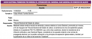 Por otra parte, el Juicio Electoral promovido por Morena impugna la Sentencia del Tribunal Electoral del Estado de Jalisco, del 5 de septiembre del 2024, que declaró inexistente la infracción atribuida al Cardenal Arzóbispo Emérito de Guadalajara, Juan Sandoval Íñiguez, consistente en la supuesta violación a las normas de propaganda electoral, por la posible vulneración a los principios de separación Iglesia-Estado y laicidad, por la publicación de un video en la red social de “Facebook”.